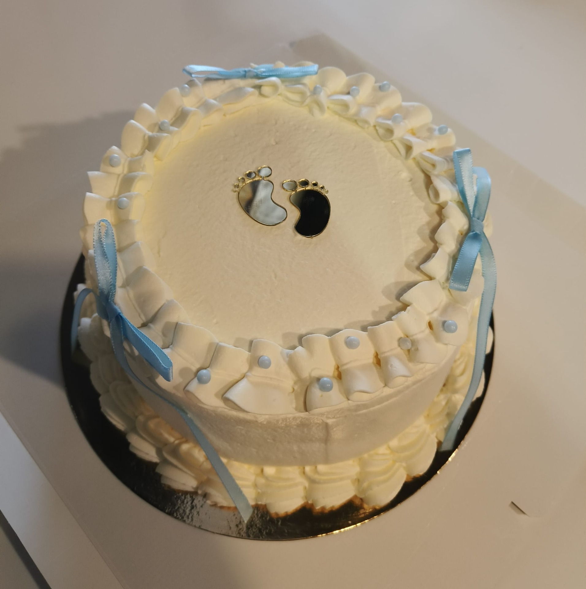 Meiltä myös esim. ristiäisiin vintagetyyliset kermakakut ruseteilla ja vauvan varpailla.